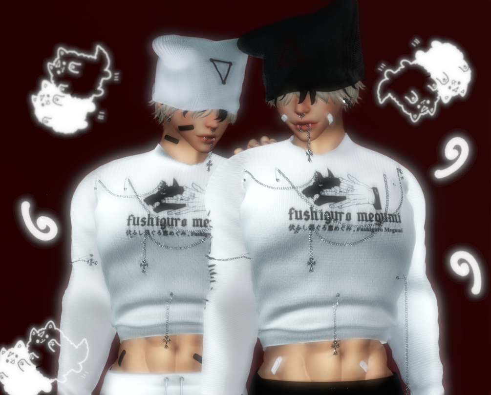 ⤷・ⓘ All together with everything 134k(The sweater has rigged chains) | Kiggy 12k | Beanie 4k | Plugs 6k | Nose ring 1k | Kat teef 520p | Bandaids 2k | Mouth Chains 10k | Chained Sweater 77k (w/out 7k) | Shorts 14k | Sockies 2k |